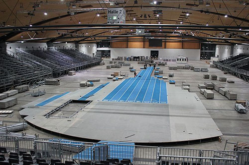 18.01.2017 Wieder wird aus der leeren 12.500 m² Messe-Halle 2 in Karlsruhe eine Leichtathletik-Arena der Weltklasse mit 4.500 Plätzen und separatem Aufwärm- und Athletenbereich.